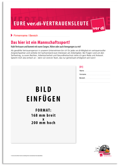 ver.di-VL-Plakate zur individuellen Vorstellung der ver.di-Vertrauensleute Diese Plakate sind leicht über Acrobat individualisierbar. Bilder und Texte können in vorgegeben Feldern paltziert werden. Eine Beschreibung hierzu findet Ihr im Ordner. Die Plakate können in A4, A3 und A2 ausgedruckt werden. verdi_Vertrauensleuteplakate.zip Archivdatei im ZIP Format [3.5 MB]