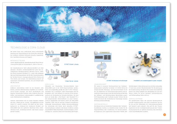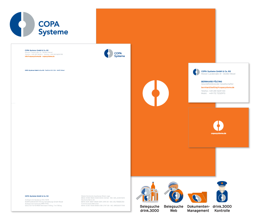 COPA System – Softwareentwickler für die Getränkebrnache – ist seit vielen Jahren mein Kunde, den ich rundum betreue. Die Gestaltung der Geschäftsausstattung, Imagbroschüre, Mappen, Anzeigen, Messegrafiken sowie die Büroraum-Gestaltung habe ich mit Freuden übernommen. Für die Einzelmodule der Software sind passende Piktogramme im ICO-Format enstanden, die allen COPA-Kunden als visuellen Unterstützung zu Nutzung der Software dienen.