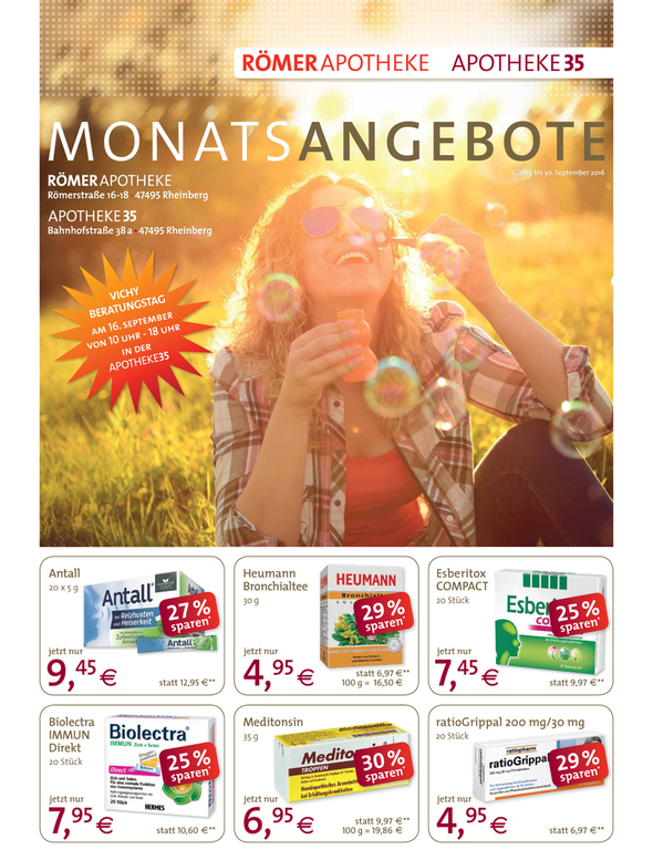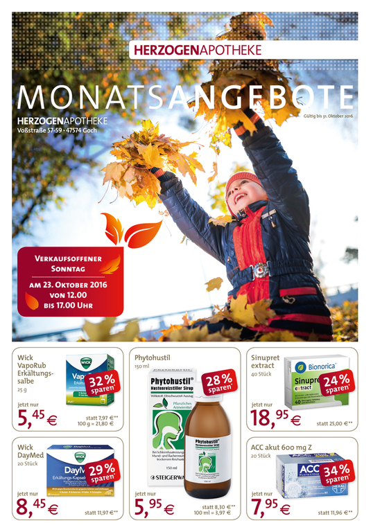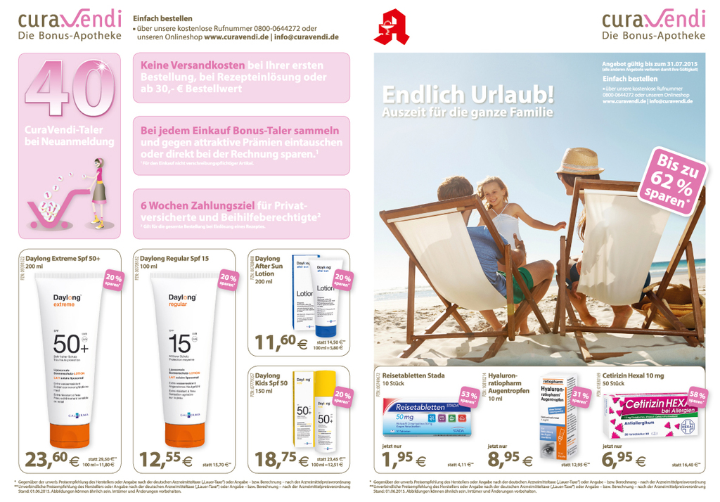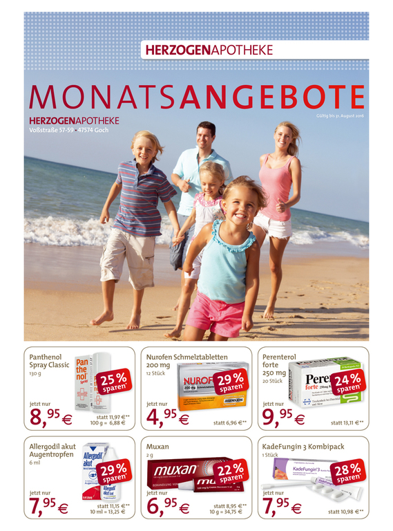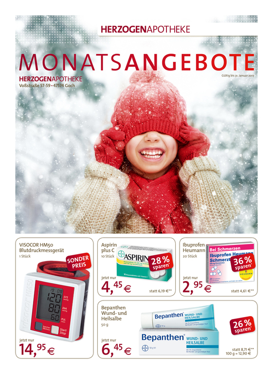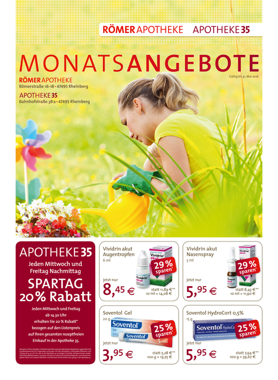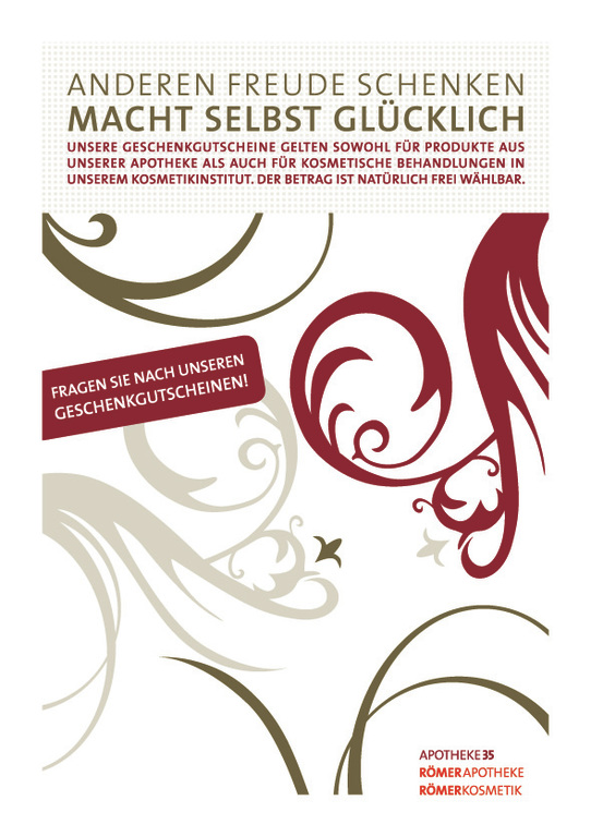 Mit monatlichen Aktionen in Form von Flyern und Anzeigen unterstütze ich drei Apotheken sowie eine Online-Apotheke und drei dazugehörige Kosmetik-Institute. Ergänzend zeige ich mich auch für die Aussbeschilderung dieser Apotheken, Kosmetik-Institute und ein Ärztehaus verantwortlich.